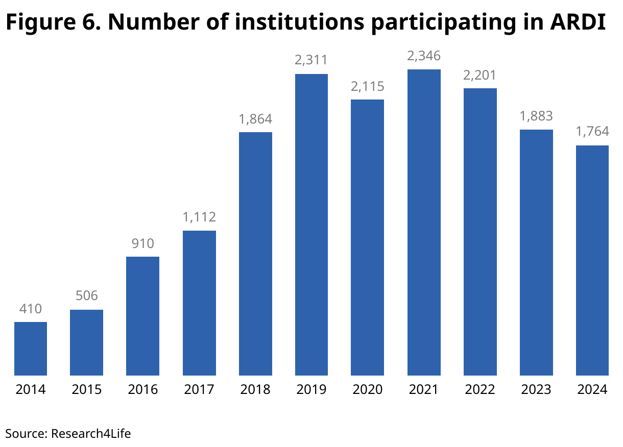 The increasing availability of open-access publications across various sources and platforms has coincided with a significant rise in ARDI logins in recent years, reflecting a growing demand for access. However, while there was a consistent growth in the availability of open-access publications through different sources and platforms, this has resulted in a noticeable fluctuation in the number of institutions participating in ARDI in recent years.