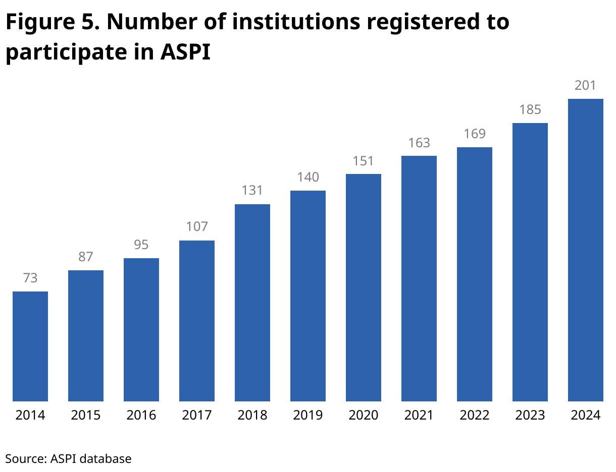 A significant portion of the institutions currently registered with ASPI includes universities and national patent offices in eligible countries. Following steady growth in interest in the program, there has been a notable increase in the registration rate in recent years.