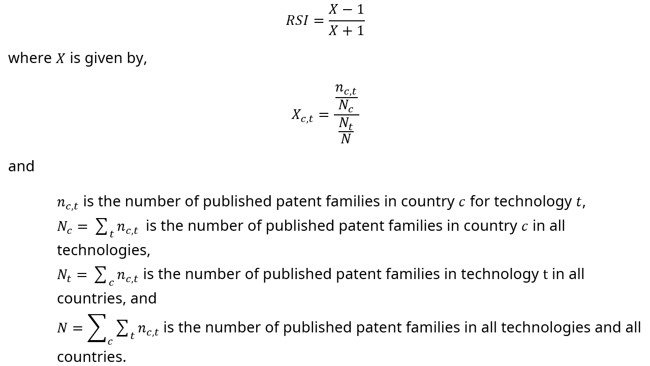 The Relative Specialization Index (RSI) compares the published patenting activity in two or more locations within the same technology area. RSI is a measure of a location’s share of patent families in a particular field of technology as a fraction of that location’s share of patent families in all fields of technology. It accounts for the fact that some locations file more patent applications than others in all fields of technology.