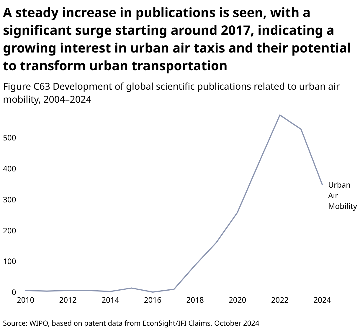 Figures C63–C65 illustrate the trends in scientific publications related to urban air taxis from 2004 to 2024 and the leading countries contributing to this research. Figure C63 shows there has been a steady increase in publications, with a significant surge starting around 2017. This trend indicates a growing interest in urban air taxis and their potential to transform urban transportation.