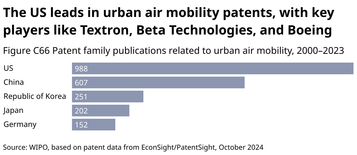 At a country level, most patent family publications were developed in the United States (988) (Figure C66). Textron, Beta Technologies and Boeing are key US research players that are developing eVTOLs. China, the Republic of Korea and Japan and Germany are other important research locations.
