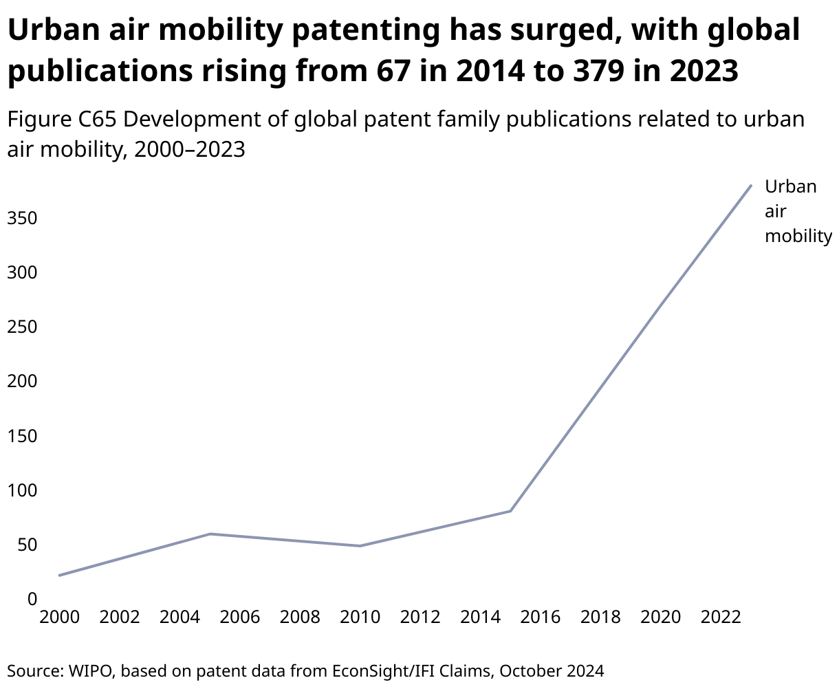 Patenting activity in the field of urban air mobility has picked up speed significantly over the last 10 years. The number of global patent family publications has jumped from 67 in 2014 to 379 in 2023 (Figure C65).