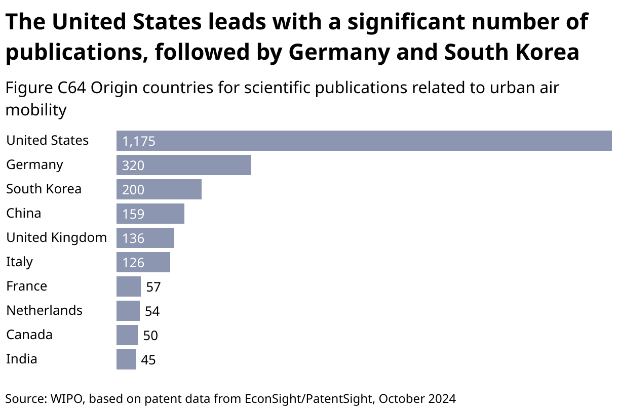 Figure C64 highlights the number of scientific publications related to urban air mobility by country. The United States leads with a significant number of publications, followed by Germany, the Republic of Korea, China, the United Kingdom, Italy, France, the the Kingdom of the Netherlands, Canada and India. This distribution reflects a global interest and investment into developing urban air mobility solutions.