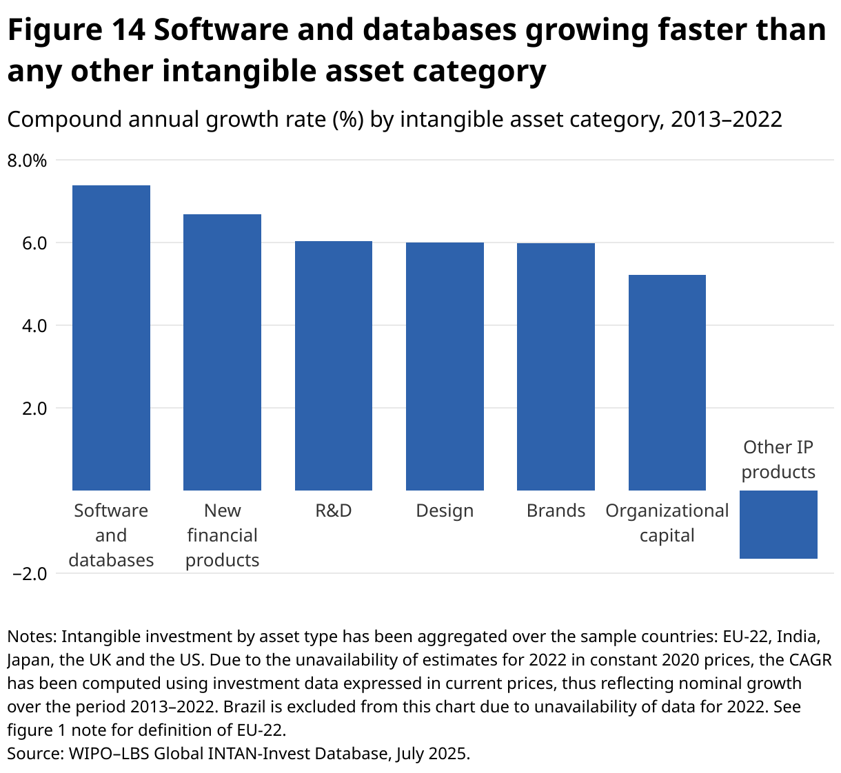 Nominal growth data reveal software and databases to have been the fastest-growing intangible asset category over the period 2013–2022, expanding at above 7 percent annually (figure 14). This asset type is followed by new financial products (a relatively tiny component of intangibles), increasing at over 6 percent in nominal terms. Investment in R&D, design and brands has also experienced a relatively fast growth rate, each of these categories growing at around 6 percent per year.