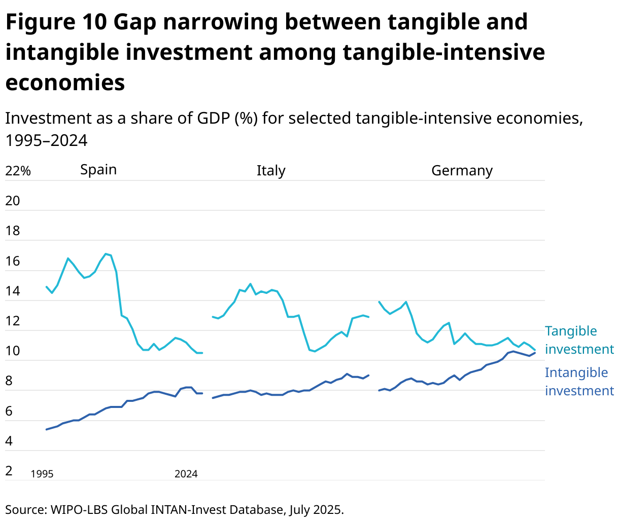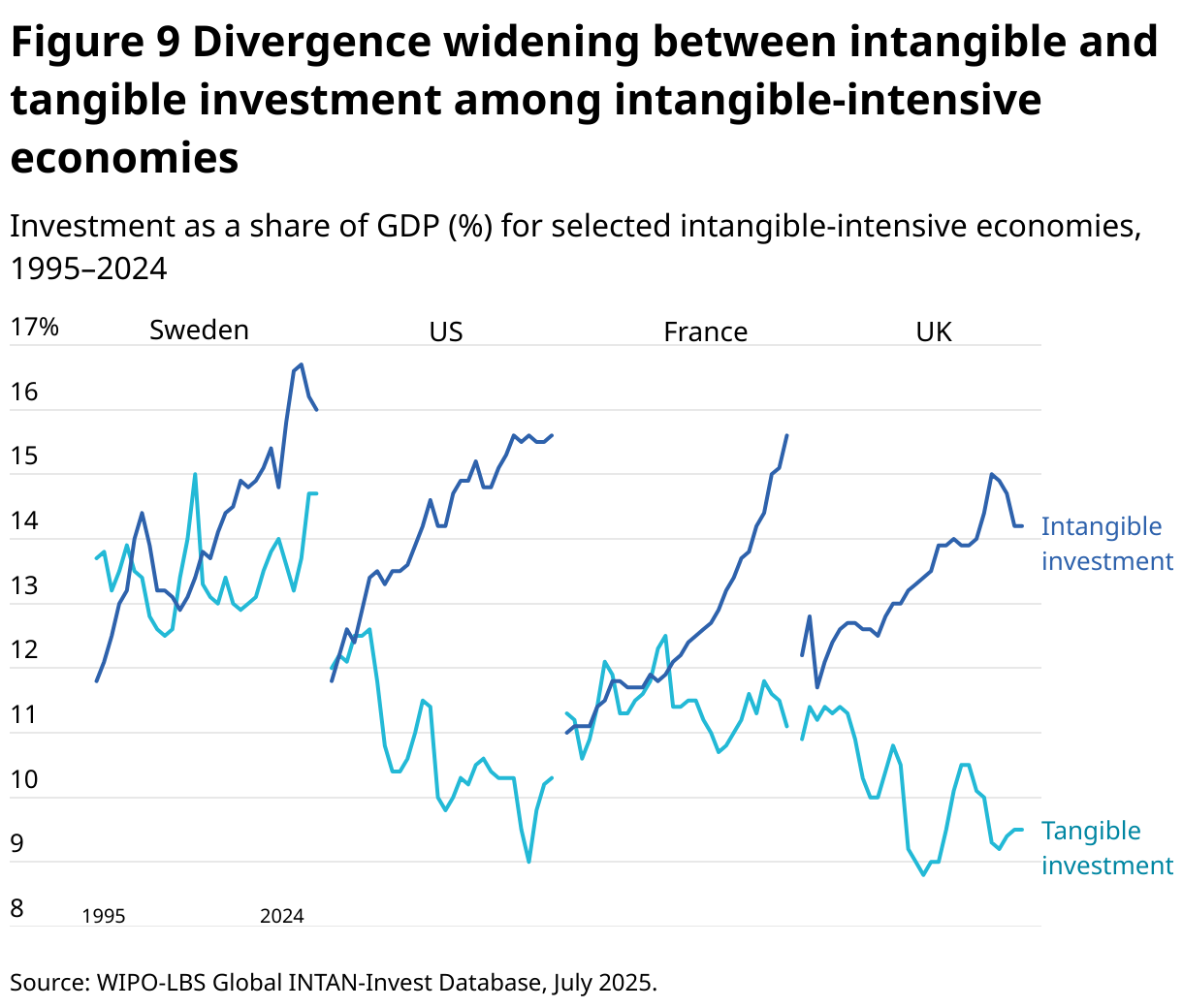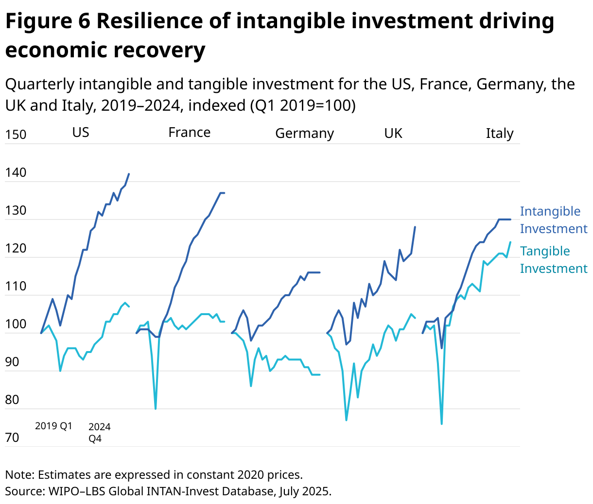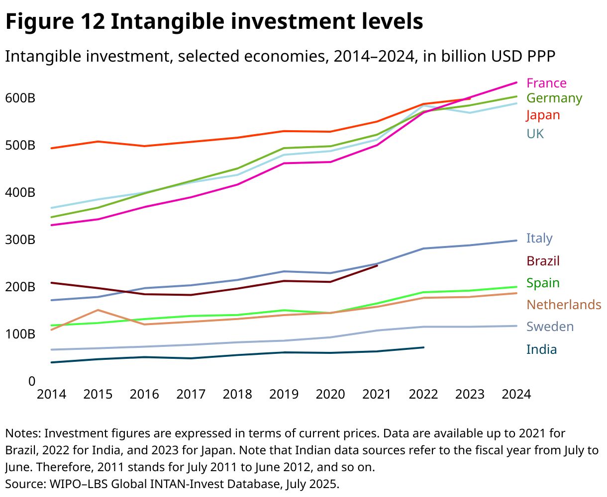 Acknowledgements: The WIIH 2025 was prepared under the general direction of Daren Tang (Director General) in WIPO's IP and Innovation Ecosystems Sector led by Marco Alemán (Assistant Director General) and, more specifically, in the Department of Economics and Data Analytics led by Carsten Fink (Chief Economist). It was managed and drafted by Anmol Kaur Grewal (Fellow) and Sacha Wunsch-Vincent (Head, Section) and in collaboration with the LBS team, led by Cecilia Jona-Lasinio (Full Professor, LBS) with contributions from Filippo Bontadini, Carol Corrado, Jonathan Haskel, Massimiliano Iommi, Florencia Jaccoud, John Lourenze Poquiz and Patrick Serberis—all part of the Global INTAN-Invest team. The feedback of the Technical Advisory Board and the Steering Committee, in particular Bart van Ark (The Productivity Institute) on Box 2, as well as the participants of the 2025 Global INTAN-Invest Conference is thankfully acknowledged. Grateful thanks are extended for the support received in producing various country estimates. For Brazil, helpful contributions were provided by Leandro Veloso, Rodrigo Ventura (National Institute of Industrial Property), and Fernanda de Negri (formerly affiliated with the Institute for Applied Economic Research). For India, valuable support was received from Vivek Kumar Singh and Ashok Sonkusare (both NITI Aayog), Shrinivas Vijay Shirke (National Accounts Division, Ministry of Statistics and Programme Implementation), and Gaurav Thakur (Permanent Mission of India in Geneva). For Japan, contributions were made by Kyoji Fukao (Research Institute of Economy, Trade and Industry) and Tsutomu Miyagawa (Gakushuin University), and thanks are extended to Tomoki Sawai (WIPO Japan Office), as well as Takeshi Ueno and Maho Furuya (both Japan Intellectual Property Association). Sincere thanks are extended to the China National Intellectual Property Administration (CNIPA) and National Bureau of Statistics (NBS) for their helpful contributions and collaboration towards the potential inclusion of the People's Republic of China in future editions of this report.
