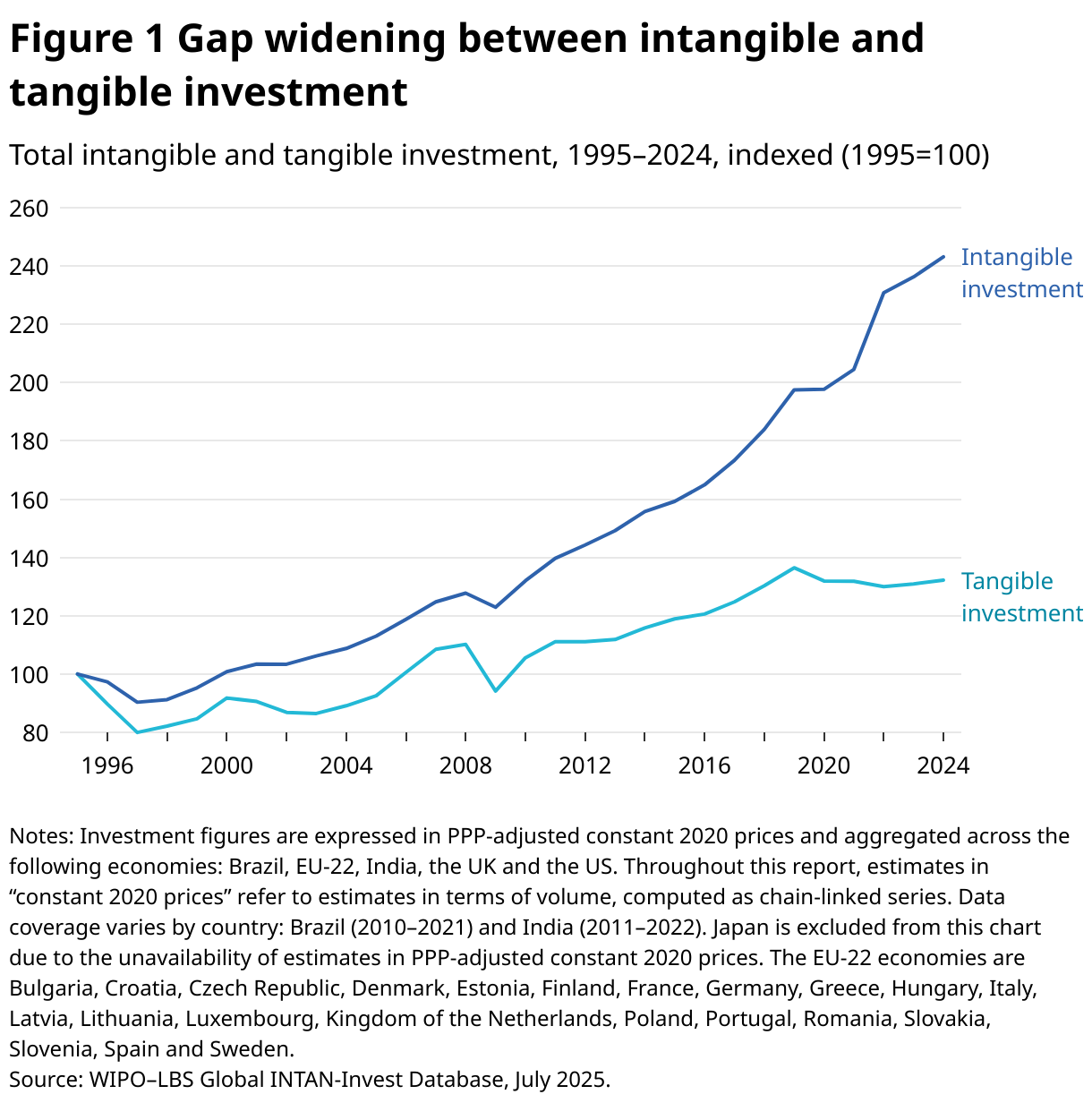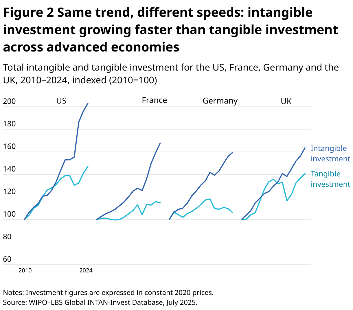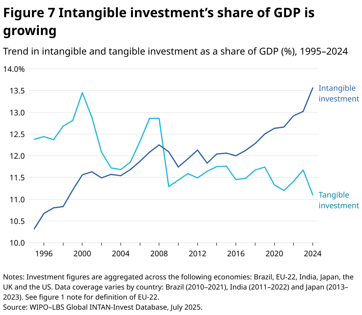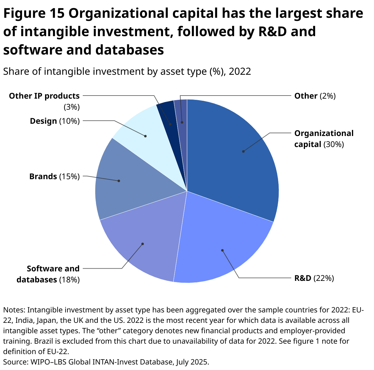 What are intangible assets? Today's most valuable companies derive their competitive advantage not from physical capital, but from intangible assets – such as R&D, software, data, design, branding, organizational know-how and skilled talent, all creating substantial economic value.