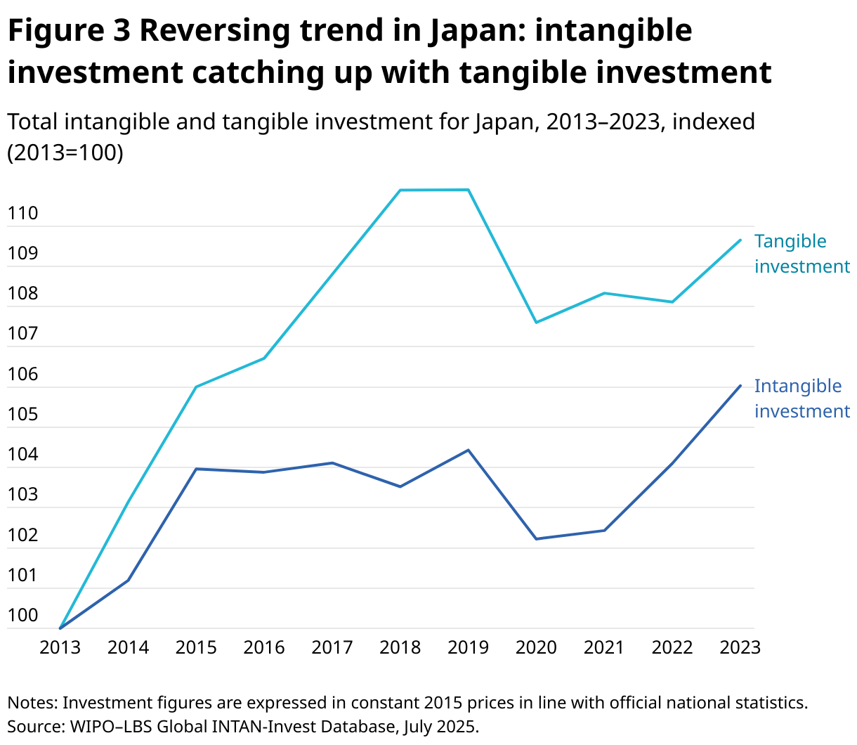 In the case of Japan, tangible investment has historically grown faster than intangible investment (figure 3). Based on updated data for Japan from 2013 to 2023, tangible investment recorded an average annual growth rate of approximately 0.9 percent. Intangible investment expanded more slowly during the same period, at a rate of 0.6 percent annually. Since 2020, however, this trend has reversed: between 2020–2023, intangible investment grew at the faster pace, averaging 1.2 percent annually compared to 0.6 percent for tangible investment.