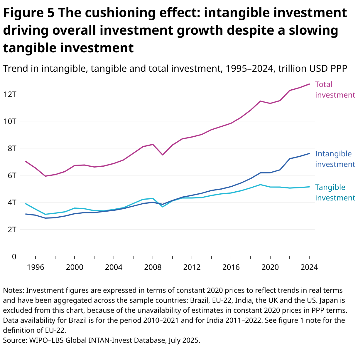 Despite macroeconomic headwinds – including inflationary pressures, interest rate hikes and declining tangible investment – total investment has maintained steady growth, driven by intangible capital formation (figure 5).
