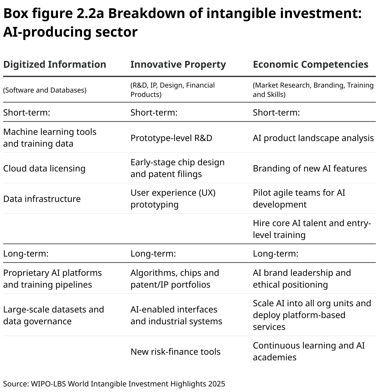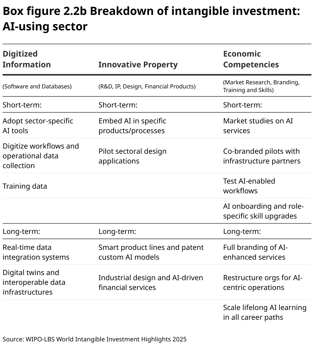 (8)See also WIPO’s Innovation Insights Blog (June 2025), Global software spending surges to close to USD 700 billion in 2024, up 50% from 2020; the United States extends its lead, available at www.wipo.int/en/web/global-innovation-index/w/blogs/2025/global-software-spending AI-producing firms invest in machine-learning tools, training datasets and proprietary platforms. AI-using sectors digitize operations and deploy sector-specific tools.Innovative property: AI-producing firms engage in prototype research, micro-chip design, and patent portfolio building. AI-using sectors embed AI into products and services, while protecting sector-specific know-how.