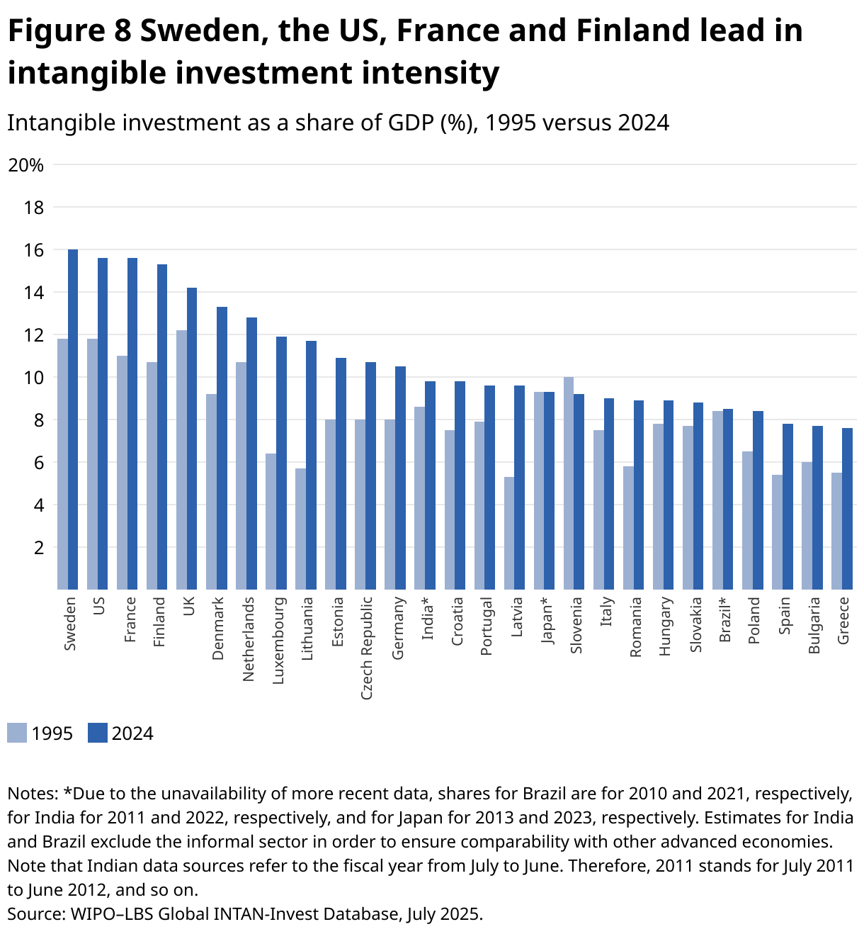 In 2024, Sweden maintained its leading position as most intangible intensive economy, reaching 16 percent of GDP. Sweden was followed by the US, France and Finland, where intangible investment accounted for over 15 percent of GDP. India's intangible investment intensity (close to 10 percent) puts it ahead of several European Union (EU) economies, as well as Japan. Brazil's intangible intensity (8.5 percent) is comparable to that of Poland (8.4 percent), while surpasses that of Spain (7.8 percent) and Greece (7.6 percent).