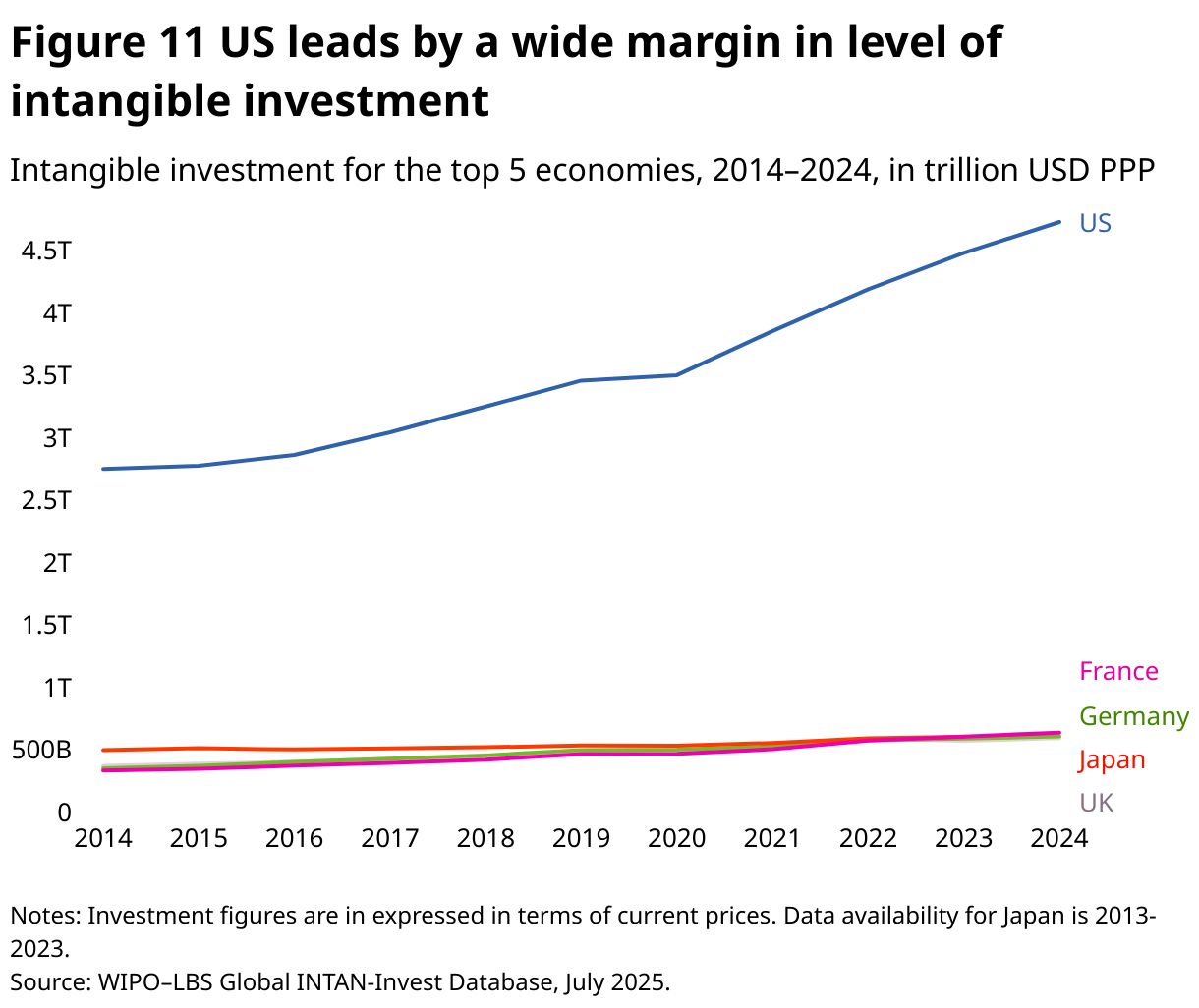 The US remains the global leader in intangible investment by a substantial margin. In 2024, its intangible investment reached USD 4.7 trillion in current prices – up from USD 4.5 trillion in 2023 and USD 4.2 trillion in 2022. This figure is nearly twice the combined total of the next most intangible-intensive economies: France, Germany, the UK and Japan (figure 11).