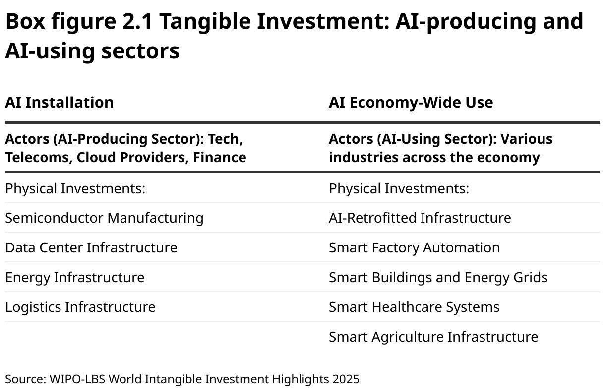 Specifically, AI drives two distinct investment waves: tangible assets for physical AI deployment and investments in three intangible asset groups, namely, digitized information, innovative property, and economic competencies (see annex figure A.2).