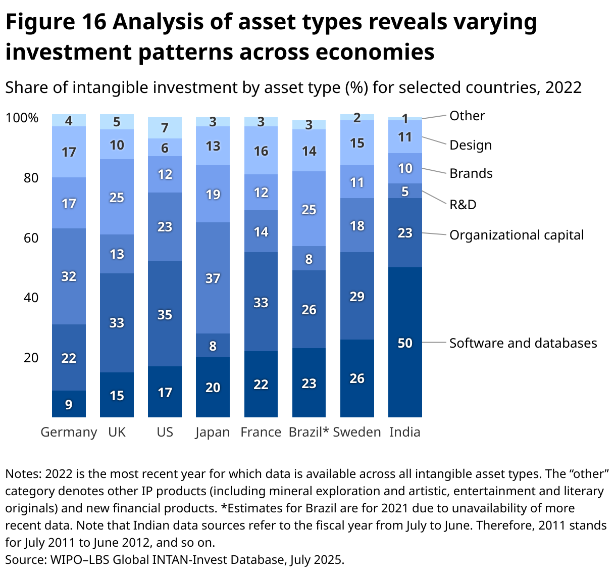Country-specific patterns show notable differences in the composition of intangible investment (figure 16). India leads in software and databases, accounting for over 50 percent of its intangible investment – well above Sweden (26 percent), Brazil (23 percent) and France (22 percent). Japan and Germany stand out for having an emphasis on R&D (37 percent and 32 percent, respectively), consistent with their strong industrial base. The US invests most heavily in organizational capital (35 percent), while France and the UK also show large shares in this category (close to 33 percent for both). Brazil and the UK lead in brands, comprising close to 25 percent of total intangible investment for both, contrasting with India (10 percent) and the US (12 percent).