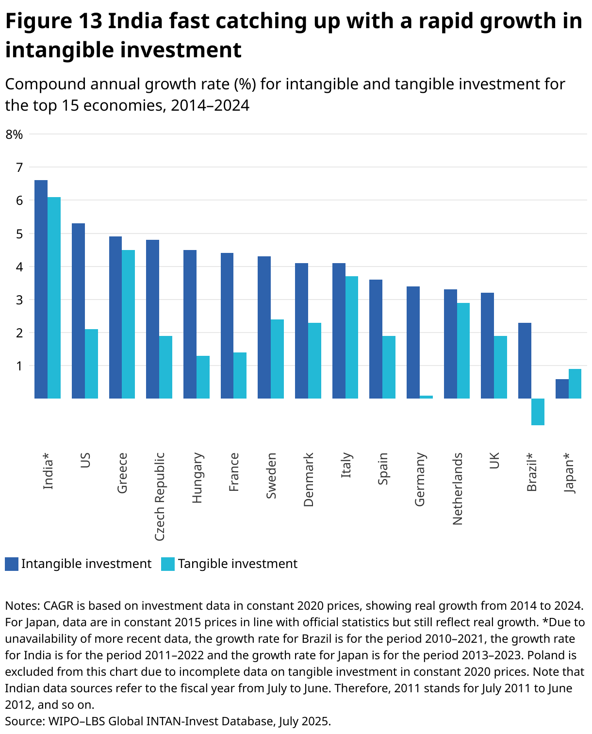 Among the top 15 largest economies (by GDP in 2024), intangible investment generally grew faster than tangible investment between 2014–2024 (figure 13). India is followed by the US, with intangible investment growing by over 5 percent annually between 2014–2024. From 2013 to 2023, Japan's investment pattern favored tangible assets, growing at 0.9 percent versus 0.6 percent for intangibles. In stark contrast, major European economies (including France, Germany, Italy, Spain and the UK) saw a strong intangible investment growth at rates between 3–4.5 percent, well ahead of their tangible investment rates.