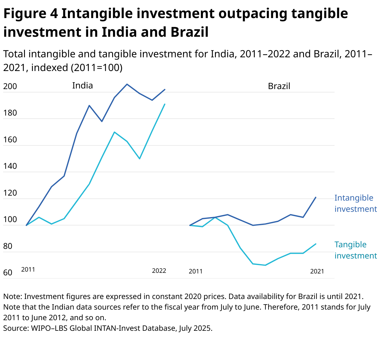Figure 4 compares the pattern of growth of intangible and tangible investment across India and Brazil. In India, both investment types recorded steady growth rates between 2011–2022, with intangible investment increasing at nearly 7 percent annually – slightly outpacing tangible investment at around 6 percent. However, the gap has narrowed since 2020, driven by an acceleration of tangible capital formation. The latest data for India show that in 2021–2022, intangible investment grew by 4 percent, whereas tangible investment grew faster at close to 12 percent.