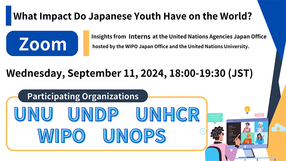 We are pleased to announce an online panel discussion inviting interns working at international organizations' Japan offices. This event is co-hosted by the WIPO Japan Office and the United Nations University, with the cooperation of participating organizations.