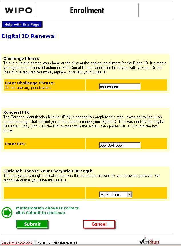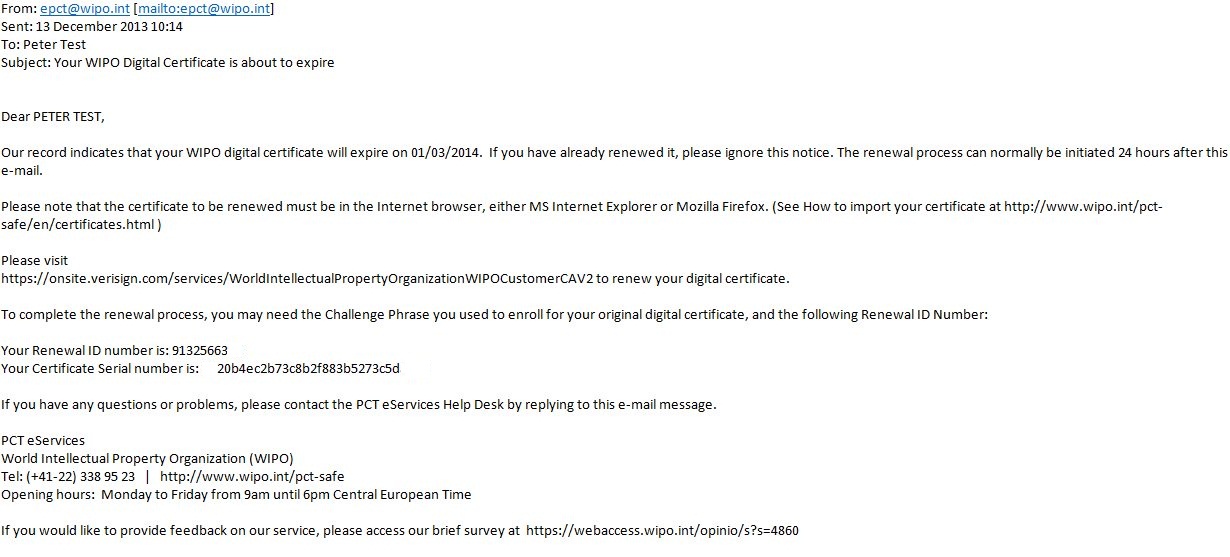 WIPO客户认证中心颁发的数字证书有效期为两年。在失效前三周时间,您将会收到一份来自epct@wipo.int的电子邮件提醒您进行续展,并且在失效前一周还会再次收到提醒: